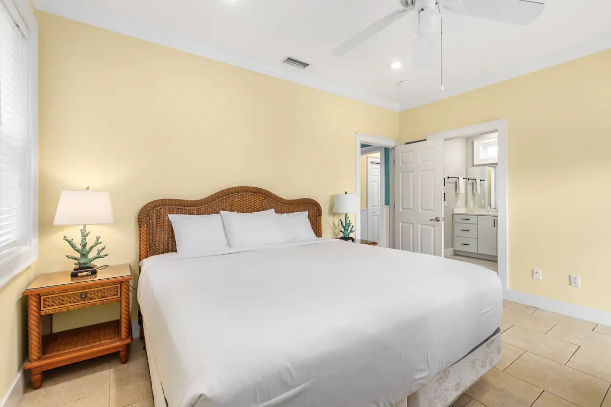 Features a luxury pillow top mattress, children’s crib, shared bathroom, and direct access to patio and pool.